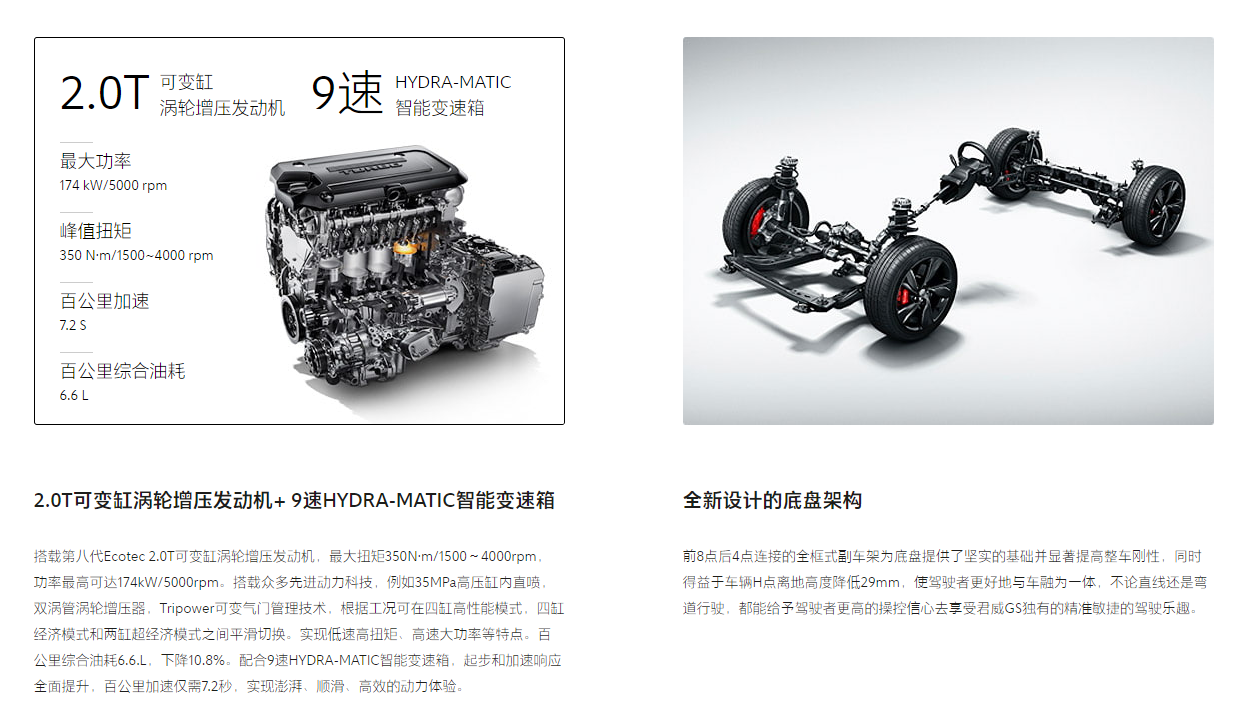 不要以为君威GS就是一款样子货,它全系标配了第八代Ecotec 2.0T发动机并匹配9AT变速箱,能输出237马力的最大功率及350牛·米的峰值扭矩。虽然相比起以往装配的2.0T SIDI发动机减少了24马力,但最大马力及峰值扭矩来得要比以往更早,能带来更好的动力响应。同时,该发动机还带有可闭缸技术,能在特定工况下仅依靠两个气缸进行工作,兼顾日常使用的燃油经济性。