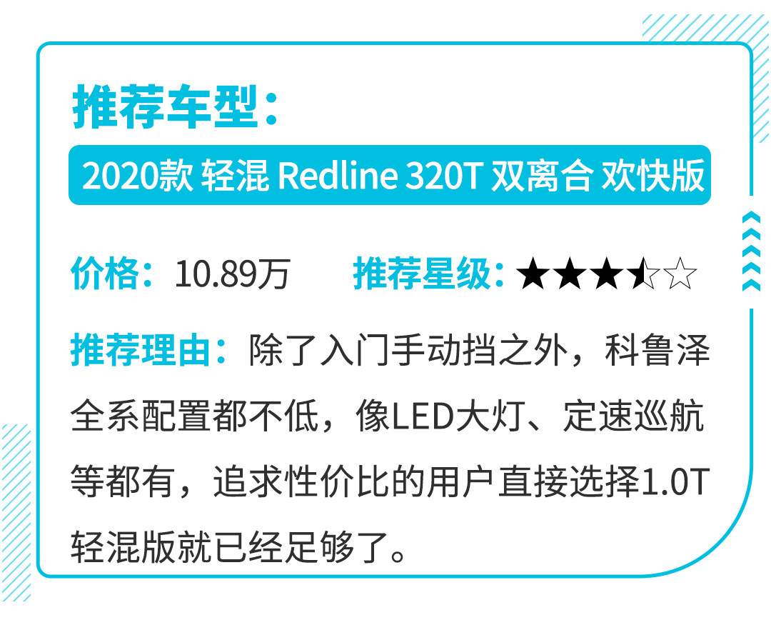 至此,科鲁泽在售车型共有1.0T涡轮增压+6MT、1.0T涡轮增压+轻混+6速双离合、1.3T涡轮增压+轻混+6AT、1.5L自吸+6AT四个动力总成版本。