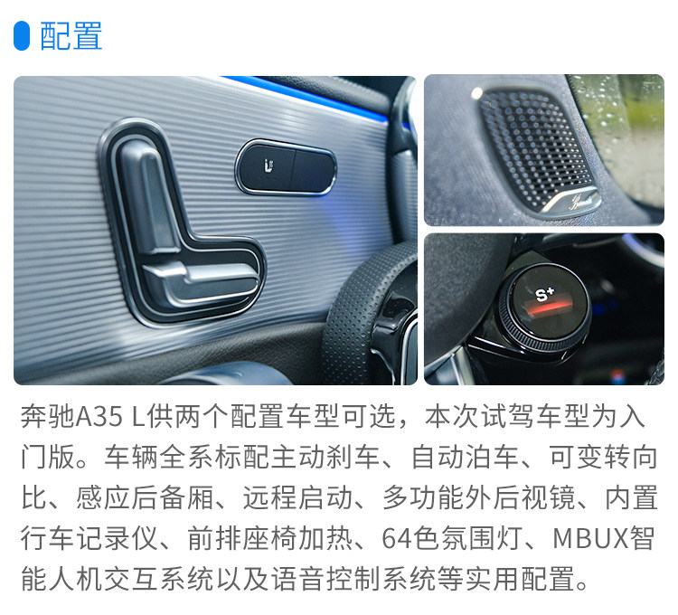 小结:和同价位车型相比,奔驰A35 L对于豪华感的营造可谓多遑不让,奢华的视觉体验让人难以招架,但在用料和做工方面还是能感受到北汽接地气的一面,尤其是座椅材质以及舱内顶棚用料。对细节处理持有执念的潜在买家,不妨留意下进口A35,但前提是你得接受少了个“屁股”的事实。