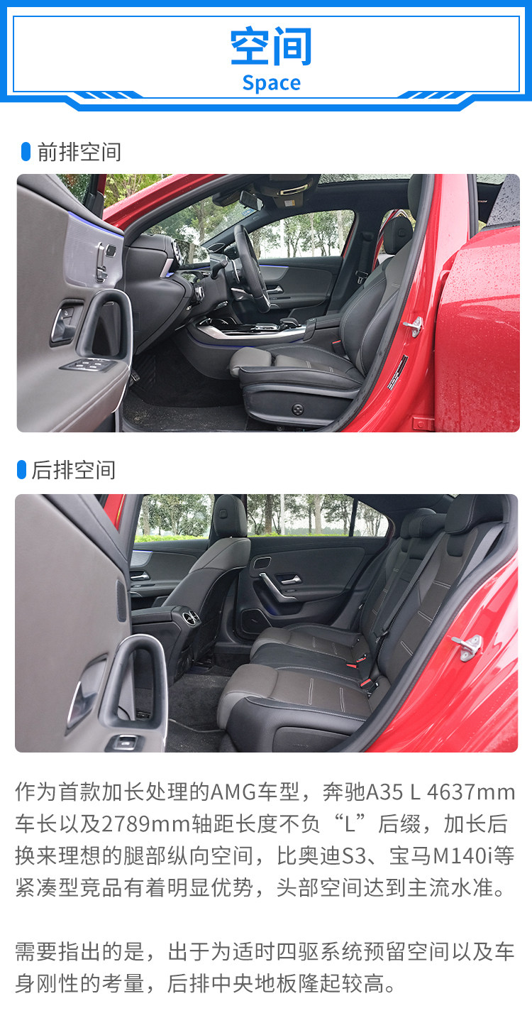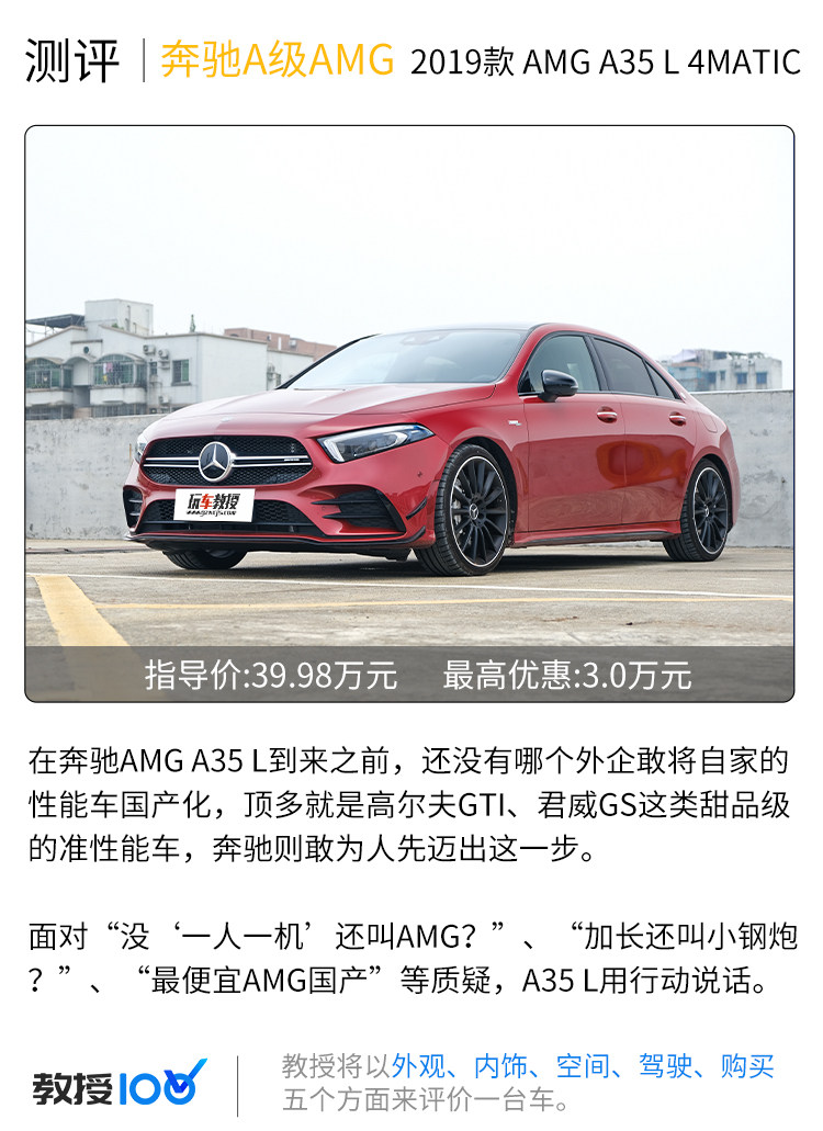 我不认为把性能车国产是件坏事,尤其是让广大车友遥不可及的AMG。站在车企角度,A35 L既不能打破品牌格调,又不能定价过高,这样一个戴着镣铐跳舞的产品开发过程,想想就头疼。所幸,出来的结果令人满意。