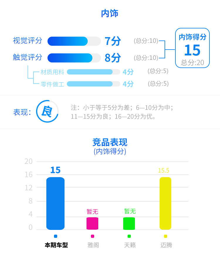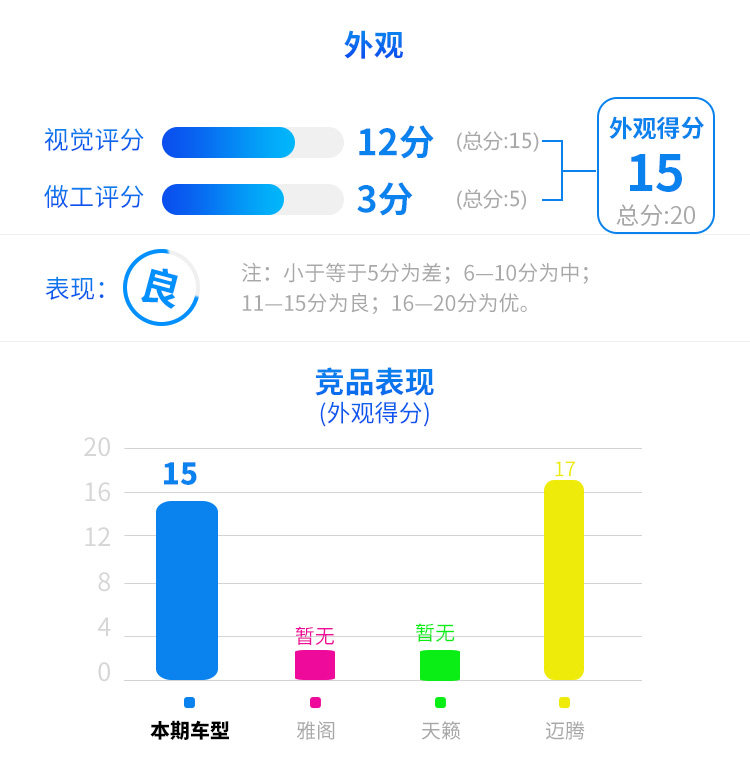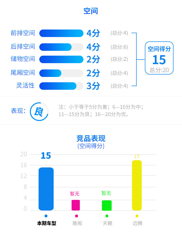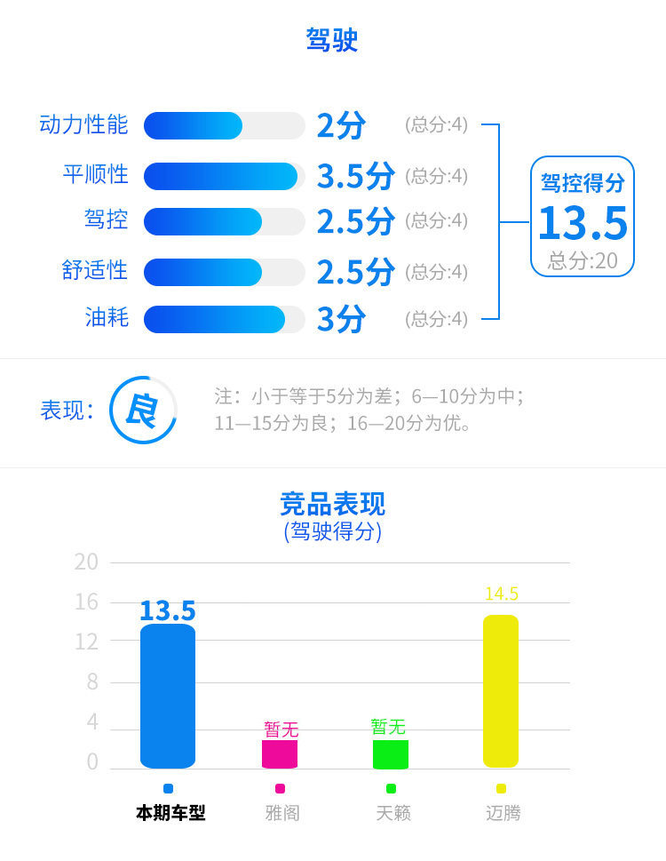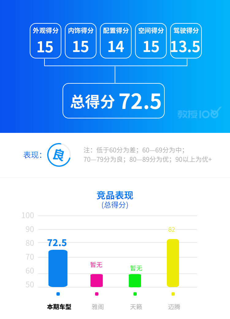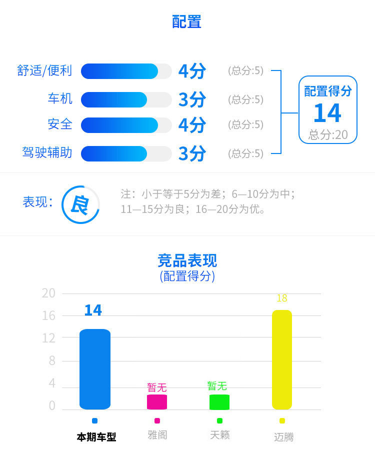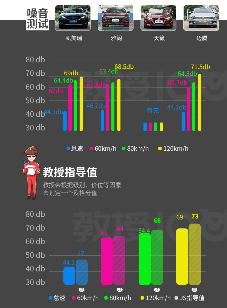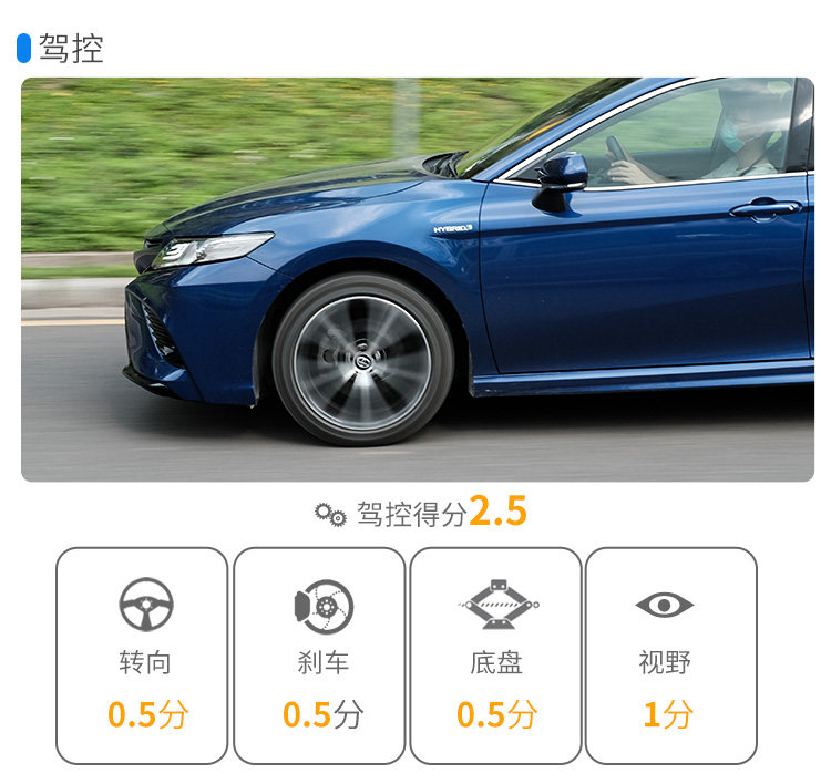 小结:大家看评分可能会有所疑惑,凯美瑞评分低于迈腾是因为测试的凯美瑞双擎运动版并不是最顶配的车型,可即便如此,它依然能获得比较高的分数,说明了凯美瑞的配置丰富。