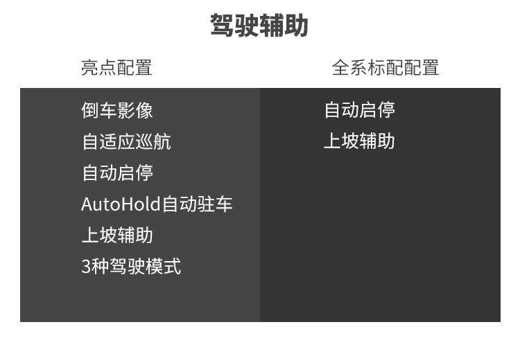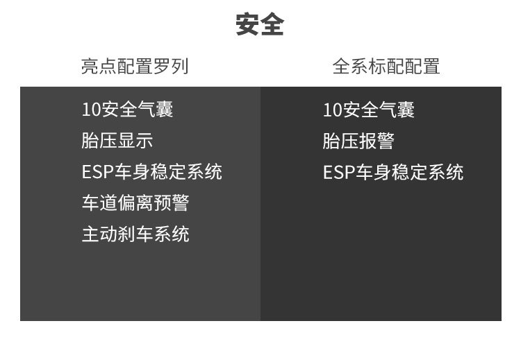 凯美瑞的亮点是全系标配10气囊,这在竞品中是独一无二的,双擎运动版还有车道偏离预警、主动刹车等配置,安全上可谓是让人放心。