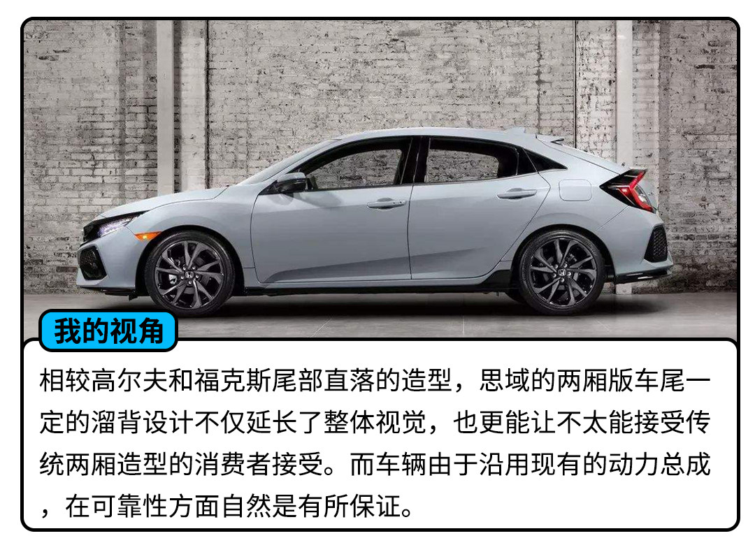 两厢版思域加入国内市场我觉得原因有二,一是与高尔夫、福克斯这类经典两厢轿车竞争,瓜分两厢A级车市场的蛋糕,而二是丰富这一消费水准消费者的选择空间,尤其如今的年轻消费者。但以国人的传统消费者审美需求来说,长车头,短车尾的经典三厢车型关注度明显高于两厢版,即便两厢版上市,思域的销量主力应该依旧会是三厢版车型。