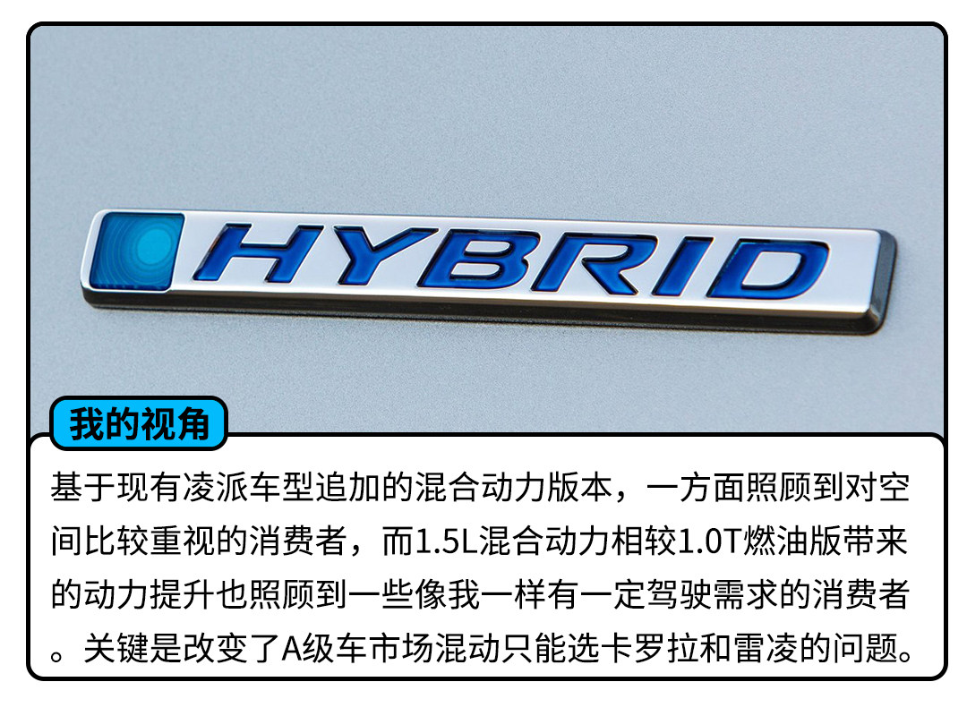 而从一般消费者角度来看,凌派混动版本的出现也打消了消费者对于燃油版车型三缸机和动力储备方面的顾虑,同时也提供了除卡罗拉和雷凌双擎外的另一款混动产品选择。