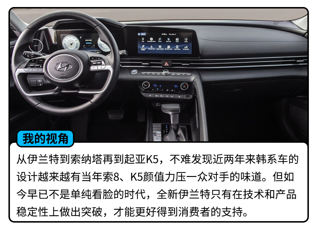 今年3月第7代伊兰特在洛杉矶,而且前段时间也初步确定车型将会在第三季度于国内上市,全新车型将会采用1.5L+CVT以及1.4T+7DCT两套动力。而根据可靠消息称,2021年还将投产1.6L发动机组成的混合动力版本。结合此前国内第七代车型公布的申报信息看,车身尺寸为4680/1810/1415mm,轴距为2720mm,基本与海外版本保持一致。