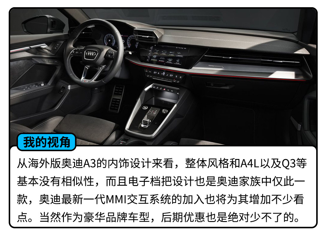 海外版车型在动力上采用的是全新1.5T发动机,而随着长春工厂生产的全新1.5TSI evo发动机进入批量试制阶段,国产奥迪A3采用全新动力方案几乎成为板上钉钉的事。不过海外版车型还提供有1.5T+48V轻混的动力版本,不知是否会一同引进。
