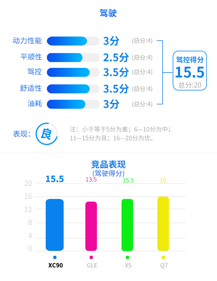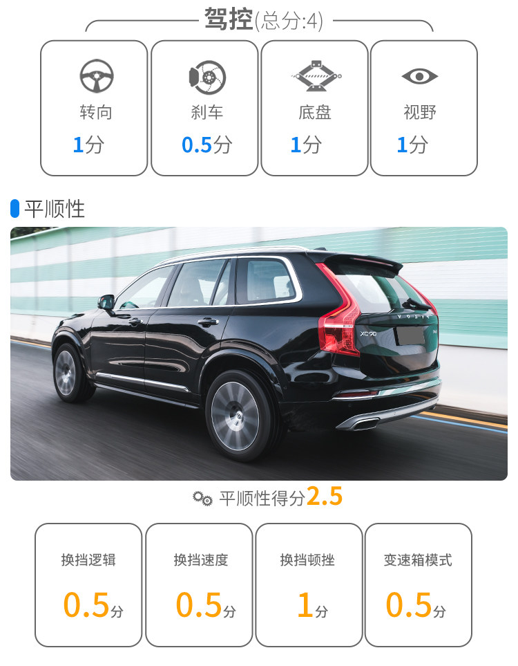 驾驶总结:总体看来,XC90并非一款能够提供丰富驾驶乐趣的车型;体型和发动机规格使其无法提供强烈的加速刺激感,但是轻盈的转向手感搭配舒适的空气悬挂,使XC90成为一款非常出色的豪华城市通勤SUV。