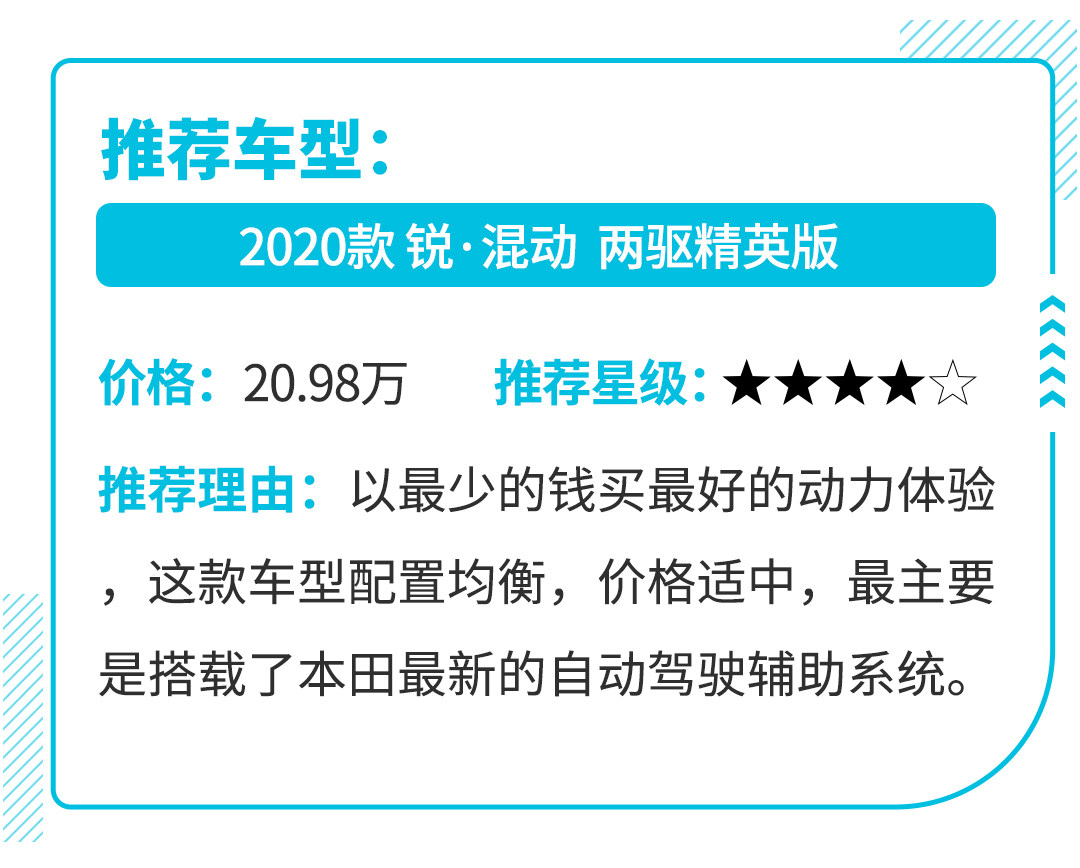 在混动车型系列,买买君更推荐于两驱锐·精英版,其这个车型是混动系列中的低配车型,售价为20.98万元,其配置了本田安全超感系统,该有的安全配置比起高配车型,主要在舒适性配置上有所差异,像皮质座椅,全景天窗未配置。