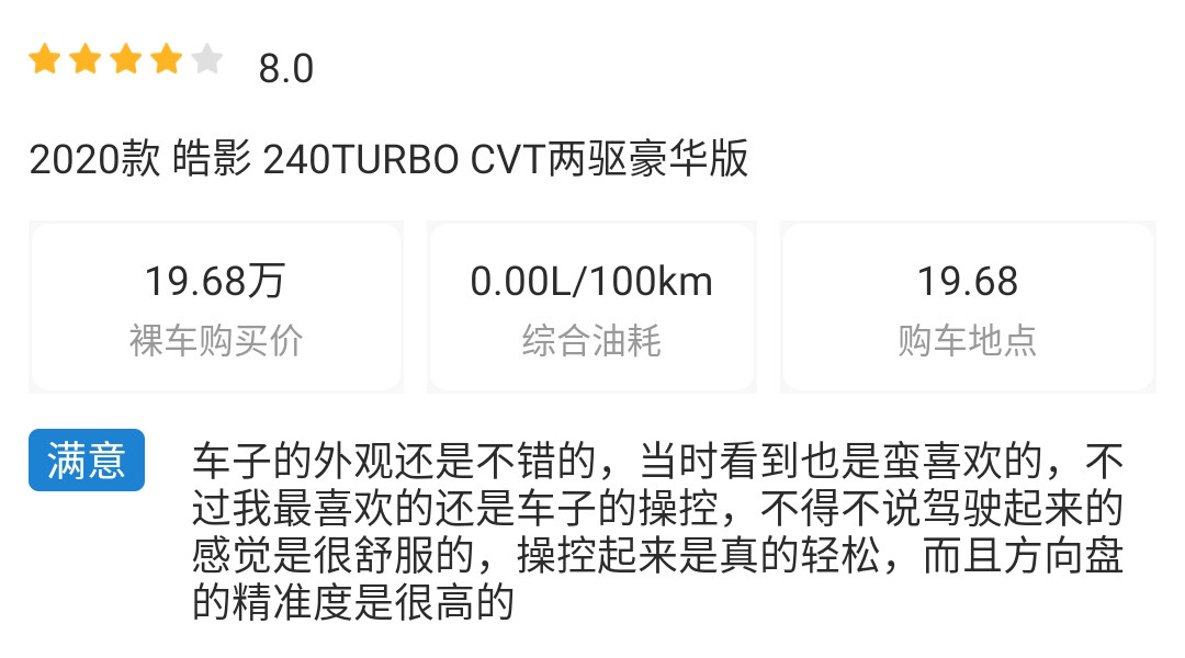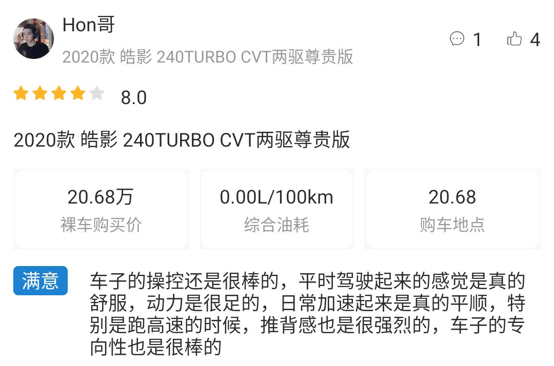 皓影推出市场已有一段时间了,市场的口碑和用户的反馈来说,基本是好评如潮,皓影现车一车难求,用户也对其作出了中肯的评价。