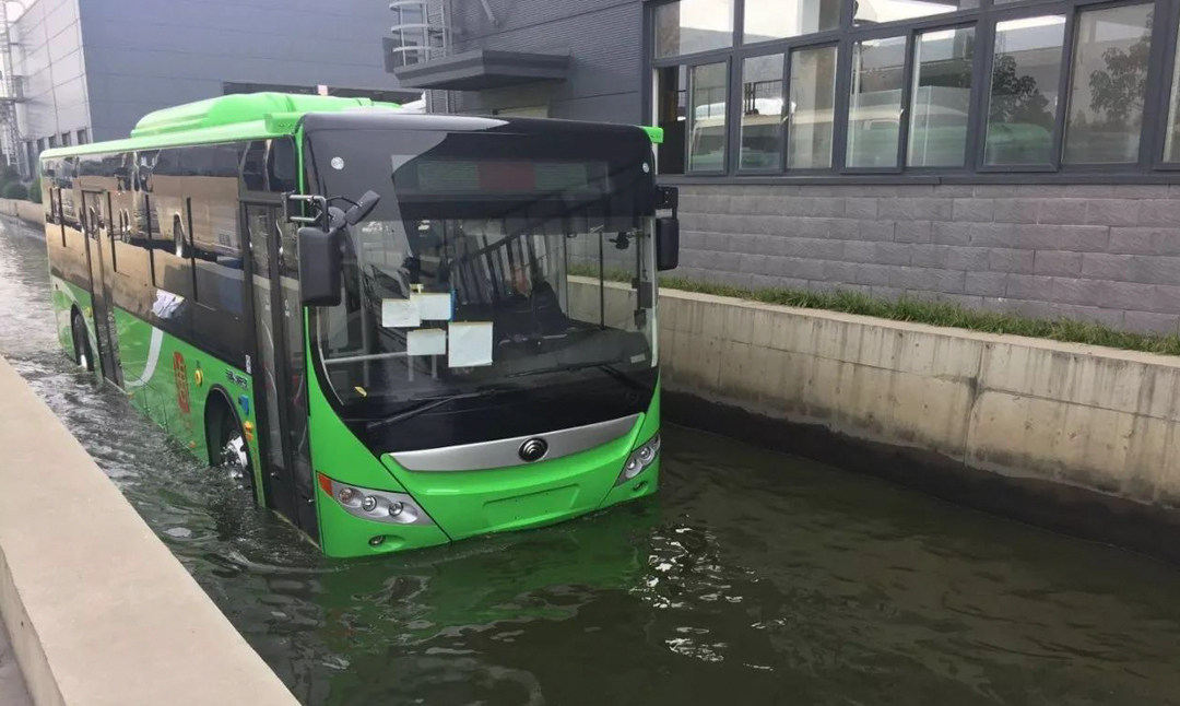 标准制定过程中,在客车浸水试验池按照标准整车浸水要完成8米纯电动客车整车浸水试验,水深 500mm,浸水时间为24h,试验完成后车辆没有发生起火、爆炸,才达到安全标准要求。