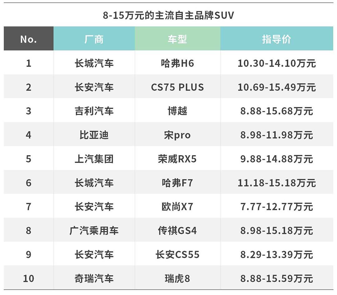 超过15万元选择自主品牌的SUV,一个很重的前提即是,产品本身没有什么质量问题且物有所值,这个物有所值当然是一个整体构成的,设计、用料、做工、配置、动力等多方面都不可或缺,这也是与合资品牌拉开差距的重要因素,最好的选择还是主流的那几个大品牌车型,起码更有保障一些。