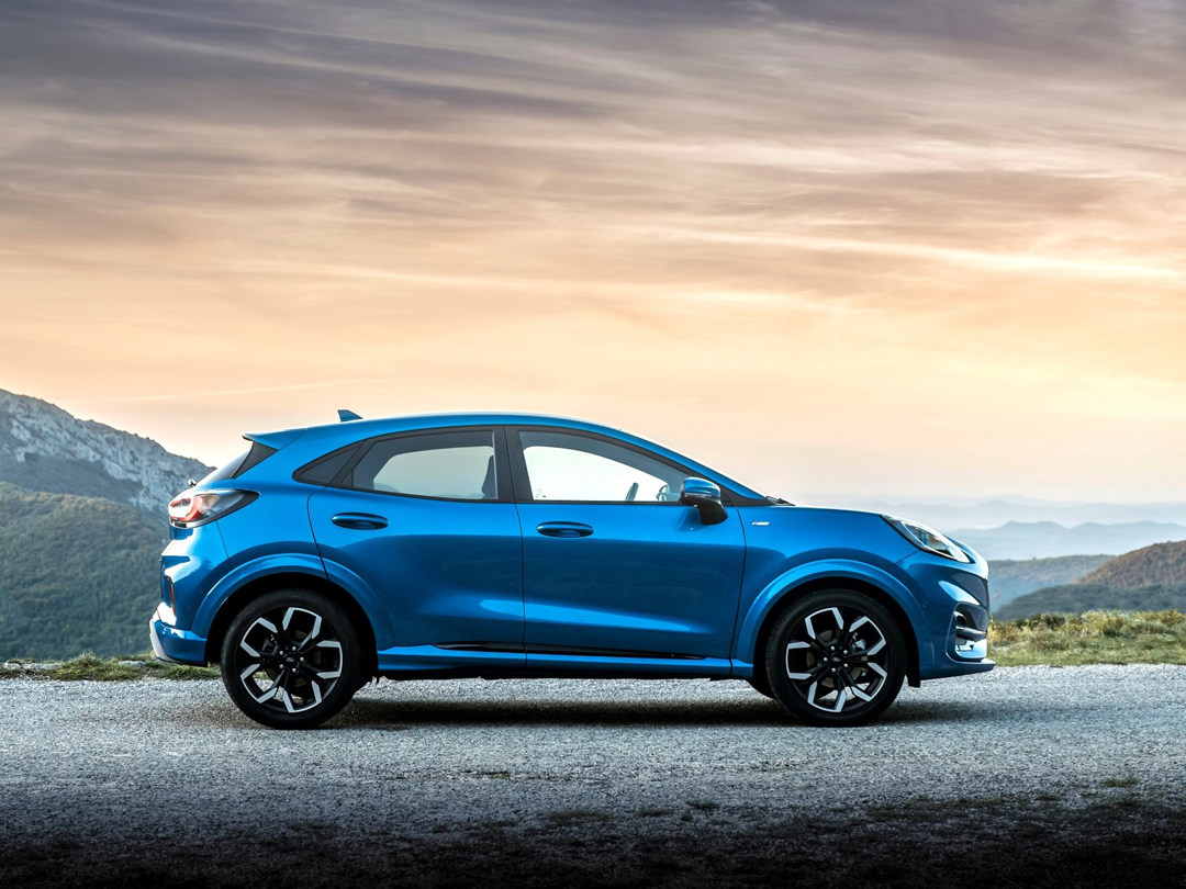 侧面看起来,PUMA的C柱角度很大,更像是轿跑式SUV的造型,侧面线条不算特别繁杂,除了从前到后并且相对平缓的腰线以外,就剩下侧裙附近的线条。此外,豪华版车型和混动版车型的轮眉会使用黑色塑料包裹,而运动版车型包括ST车型都会使用车身同色的饰件。