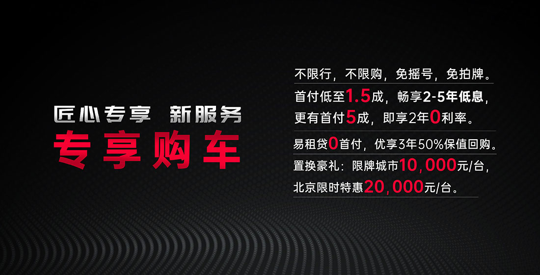专享购车方面,首付低至1.5成,畅享2-5年低息购车,以及首付5成,享2年0利率的购车政策,同时还推出了易租贷业务,可实现0首付以及优享3年50%保值回购。此外,针对置换用户推出置换豪礼业务,全国非限购城市优惠8000元/台,限牌城市优惠10000元/台,北京地区限时特惠20000元/台。