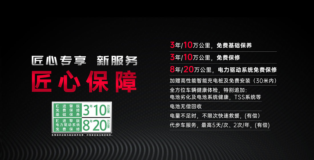 匠心保障方面,提供彰显品质自信与对客诚意的3年/10万公里免费基础保养、3年/10万公里免费保修、8年/20万公里电力驱动系统免费保修政策,并提供赠送高性能智能及免费安装充电桩、全方位车辆健康体检、电池无偿回收,快速救援、代步车等服务。实现了从购买、使用到售后的全生命周期覆盖,有效解决了消费者对纯电动车型的充电焦虑、续航焦虑、售后焦虑及保值焦虑。