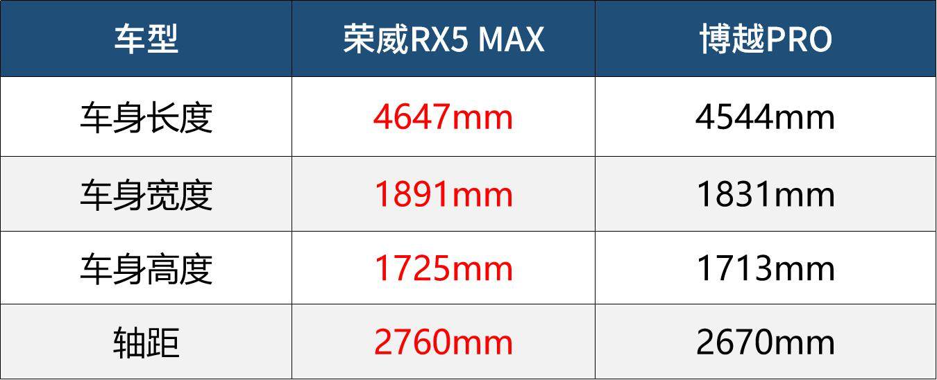 从上表可以直观地看到,荣威RX5 MAX无论是车身尺寸还是轴距都全面碾压了博越PRO,而且荣威RX5 MAX的轴距达到了夸张的2760mm,妥妥中型SUV的水准了,这可以转化为超大的实际驾乘空间,后排空间非常宽敞,即使你约的妹子是身高190cm排球运动员,在后排依然可以轻松翘起二郎腿。博越PRO的空间表现在同级车型中的表现就比较一般,和荣威RX5 MAX相比有不小的差距。