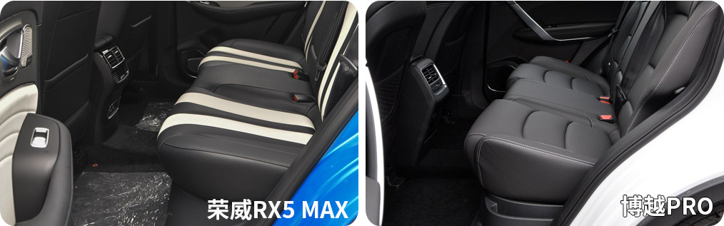 当然,要坐得舒服,除了大空间,坐垫承托的情况也是影响因素。荣威RX5 MAX的前/后坐垫长分别为530/500mm,博越PRO为480/460mm,荣威RX5 MAX能带来更充分的腿部承托,乘坐体验更加舒服。