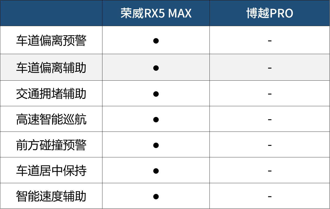 主动安全现在越来越受消费者的青睐,可以最大限度防患于未然,从上表可以直观看到,荣威RX5 MAX相比博越PRO来说更让人放心,搭载了AI Pilot智能驾驶辅助系统,通过ACC全速域自适应巡航、TJA交通拥堵辅助、ICA高速智能巡航、FCW前方碰撞预警、AEB自动紧急刹车、LDW车道偏离预警、LDP车道偏离辅助、SAS智能速度辅助、LKA车道居中保持系统等多项主动安全辅助科技,不仅提供了全方位的安全守护,也可以大大解放双脚双眼,驾驶轻松惬意,安心和妹子谈笑风生。相比之下,博越PRO的上述主动安全配置都暂处于缺席状态,主动安全防护能力不够到位。