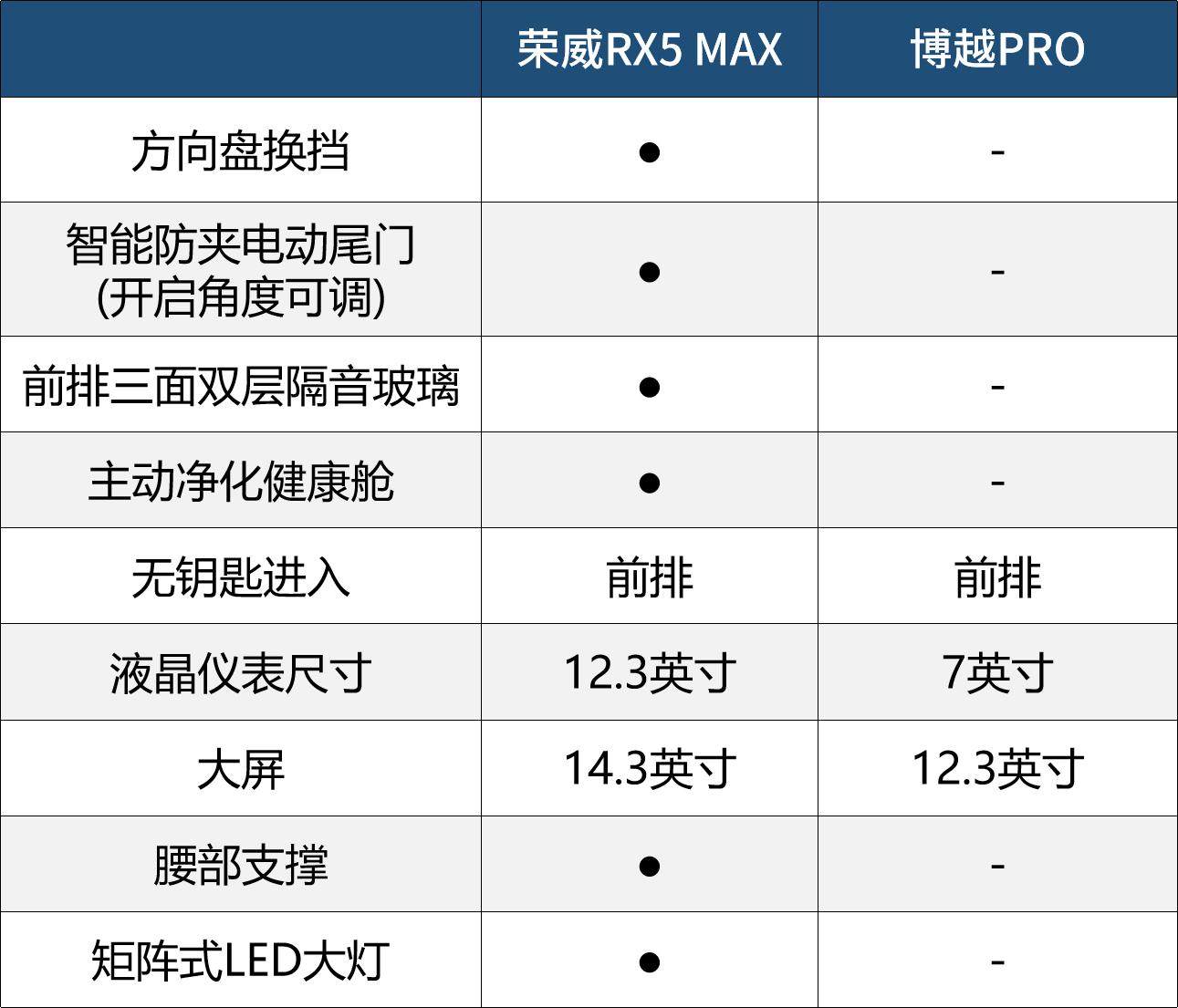 科技配置方面,荣威RX5 MAX还配备了12.3英寸仪表盘+14.3英寸双大屏,屏幕采用了2.5D四曲面等高级工艺,视觉效果和高级感非常突出。相比之下,博越PRO配备了7英寸的仪表盘+12.3英寸中控屏,相比双屏尺寸都小了一圈,呈现效果和触感略为逊色。另外,荣威RX5 MAX还搭载方向盘换挡、智能防夹电动尾门(开启角度可调)、前排三面双层隔音玻璃、前排无钥匙进入、腰部支撑、矩阵式LED大灯等丰富配置,可谓诚意满满,品价比更加突出。