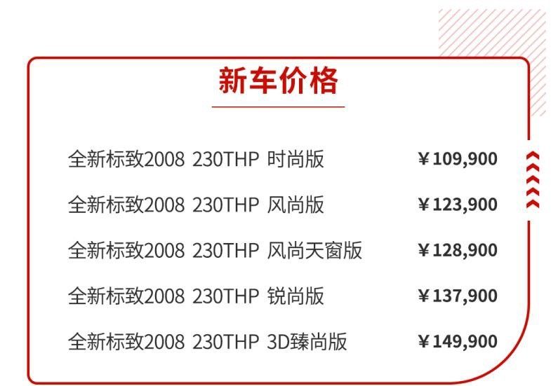 全新一代2008基于PSA集团最新的CMP平台打造,在动力方面,本次上市的燃油版230 THP车型全系搭载1.2T三缸涡轮增压发动机,最大功率为136马力,最大扭矩为230牛·米,传动匹配6速双离合变速箱,而官方公布的百公里油耗为5L。