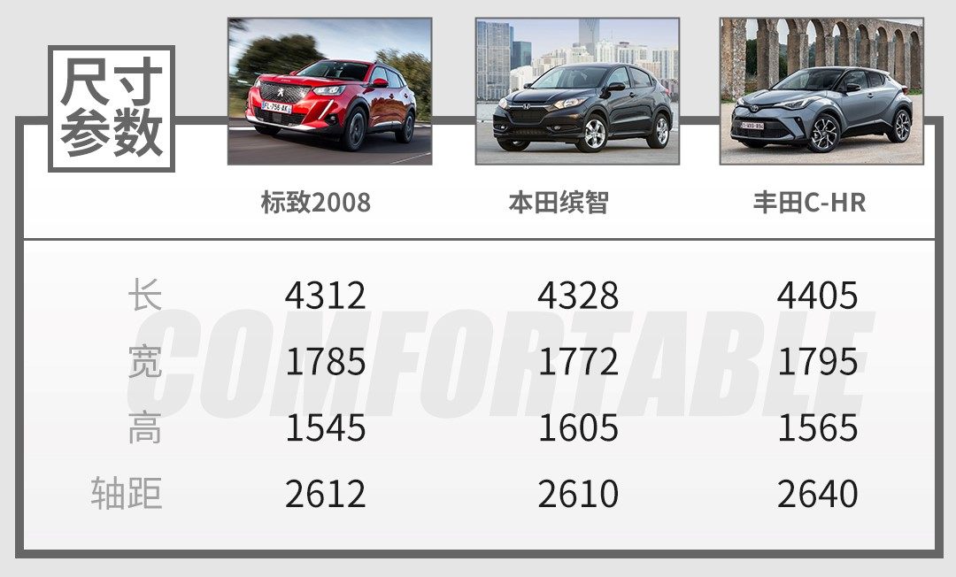 全新一代标致2008的尺寸相比旧款有所提升,而相比起同级别的本田缤智和丰田C-HR数据也很接近,其中全新标致2008的轴距还超越了本田缤智,相信乘坐空间表现将比旧款2008更出色。