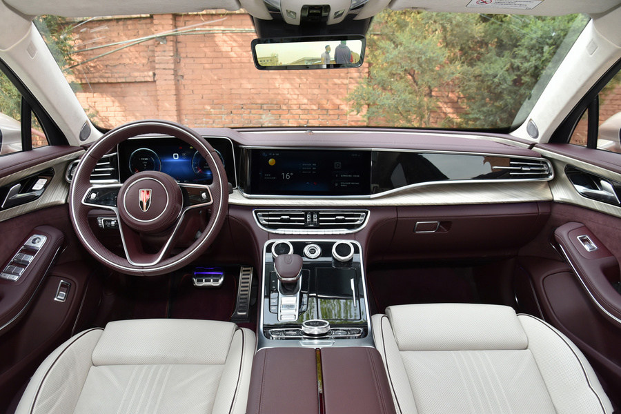 红旗H9中控台的横向视觉效果丰满,在仪表和中控屏中央采用了弯曲设计,搭配右侧的浮雕,让中控台很有层次感,仪表盘和中控屏均采用大尺寸液晶屏。在前后排中央扶手上都有一条与车头红线相呼应的设计,让品牌形象用简约的手法体融入到这些细节中。可以红旗H9的内饰有着自己的特色,营造的气势也符合这个级别车型该有的表现。