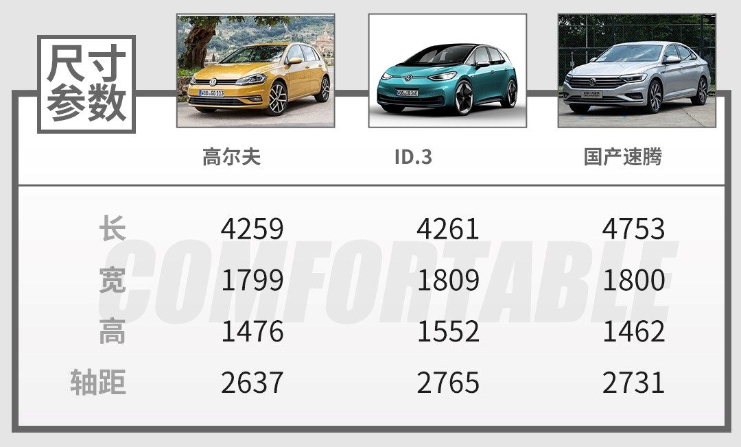 首先是车身尺寸,ID.3的长宽高分别为4261/1809/1552mm,而轴距为2765mm,通过对比可发现,大众ID.3的尺寸与高尔夫接近,但轴距却比高尔夫更长,甚至还超越了国内的速腾,这完全得益于MEB架构的功劳。