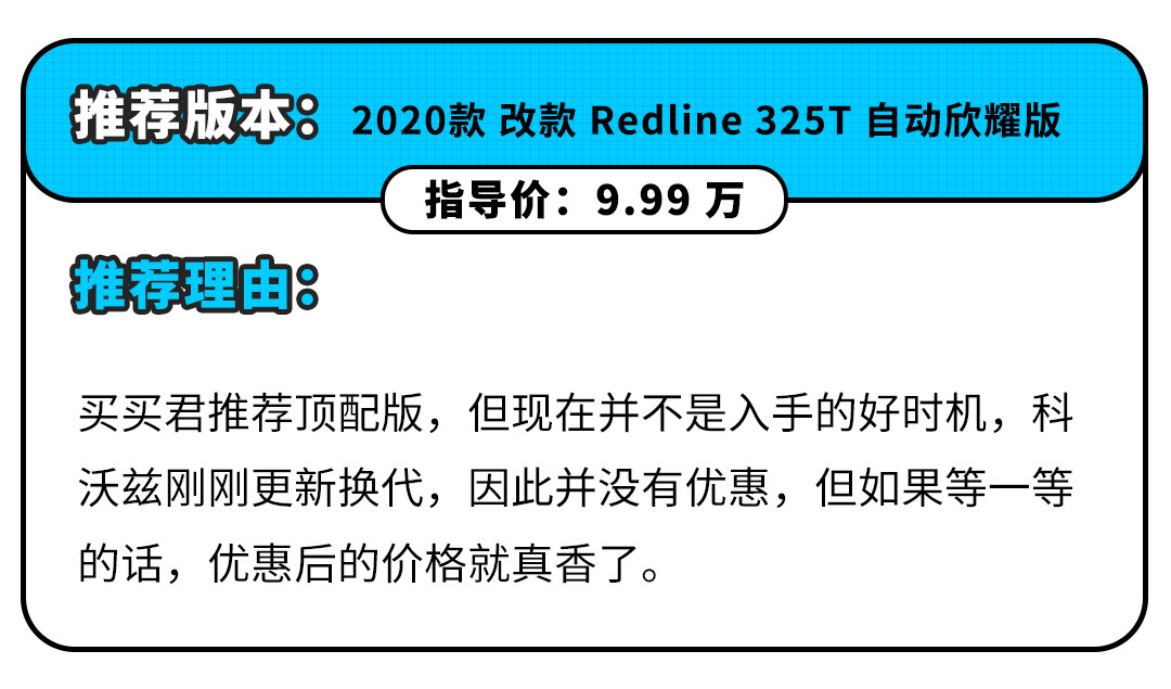 雪佛兰科沃兹推荐Redline 325T 自动欣耀版,也就是改款的顶配版,原因也是因为指导价不过9.99万元。不过想入手的,买买君劝你可以多等一等,现在的科沃兹改款刚刚上市,优惠自然还需要多等一段时间,如果能以旧款2万元的优惠拿下顶配的话,那真的是超值啦。