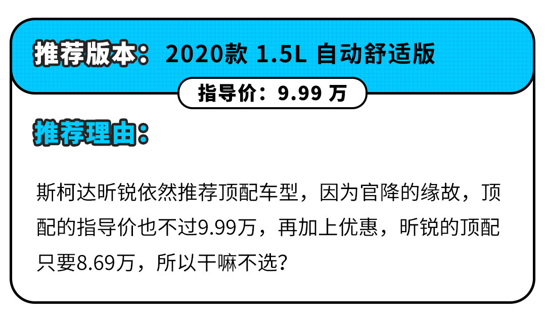 买买推荐车型为顶配版自动舒适版,其实越是像斯柯达昕锐这样打性价比牌的车型,越应该选择顶配版车型。因为顶配版基本上是配置最为丰富,溢价也相对更小的存在,再说昕锐顶配版售价也在10万以内,你买不了吃亏的,你买不了上当。