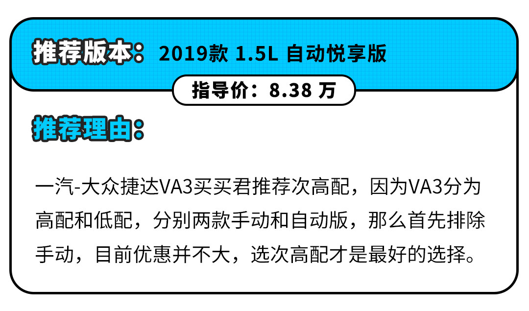 买买君推荐的车型为次顶配的自动享悦版,价格仅仅需要8.38万元,在捷达VA3目前优惠并不大的情况下,是性价比最高的选择。因为捷达VA3共上市四款车型,其中两款手动,两款自动,而选顶配车型也仅仅增加自动头灯和大灯延时关闭,那完全没有必要。