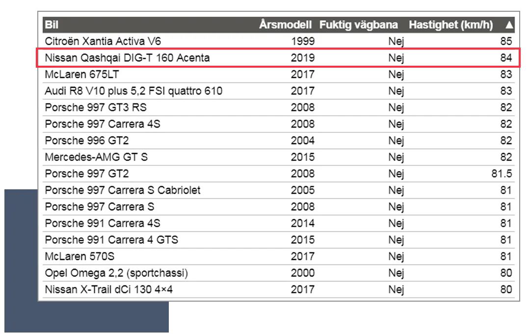 首先欧洲人喜欢什么车?答案是小钢炮。小钢炮有什么特点?动力强底盘稳操控好。只要能跟这几个优点沾上边,那么欧洲市场销量就稳了!直觉告诉我,有必要查查逍客的底盘,于是我又去翻了翻麋鹿测试的发明者,瑞典一家杂志的测试数据,结果让人感到很惊讶!