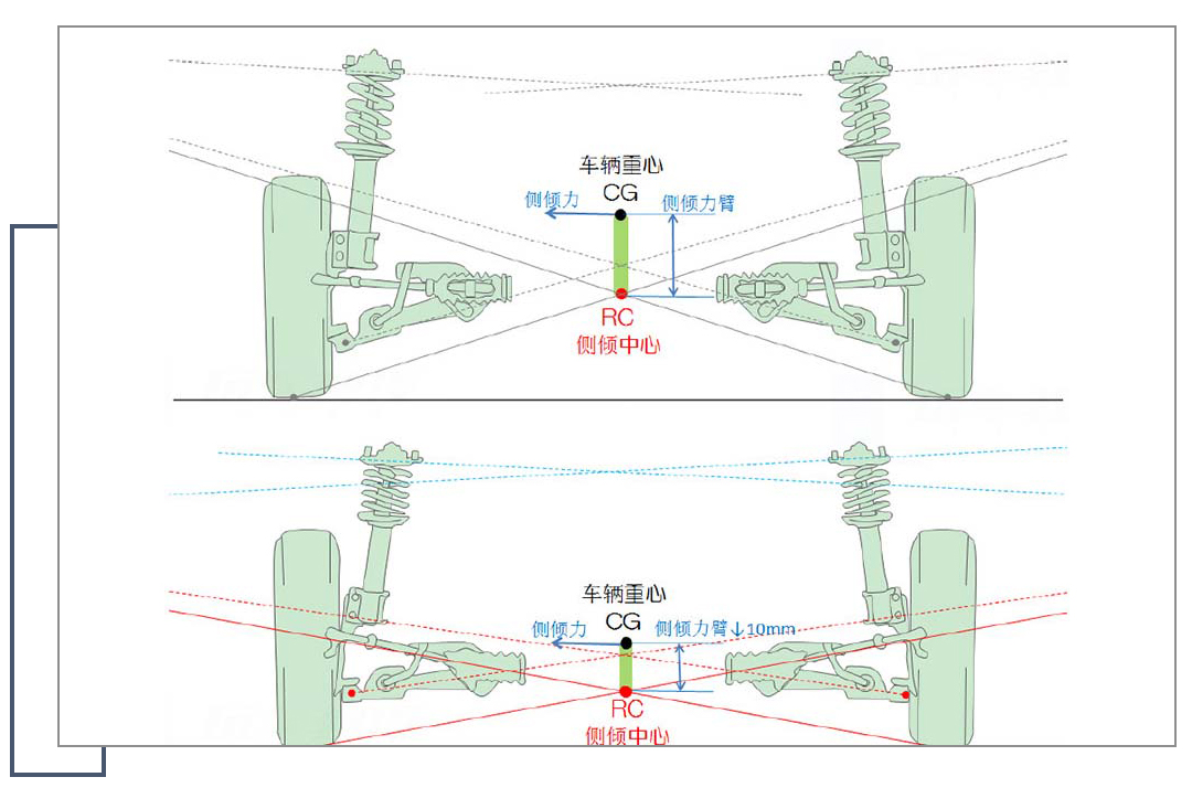 逍客是一款很独特的SUV,它的离地间隙有183毫米,这是目前同级最高水平。但离地间隙高意味着车辆的重心也高,一定程度上削弱了底盘运动性能。有什么办法去补救呢?答案是从动力总成布置与悬架结构优化入手。如果能降低悬架的滚动中心,同时缩小车辆重心与悬架滚动中心的距离,那么侧倾就会被控制的很小,间接使左右车轮的附着力在弯道尽量保持一致。