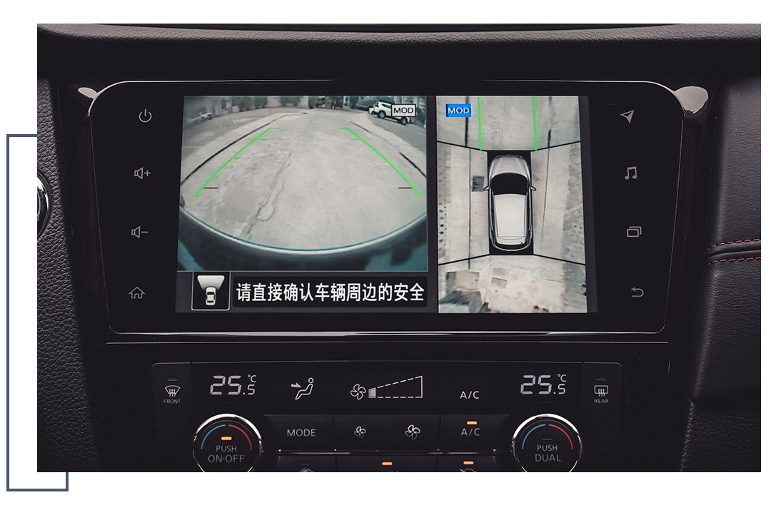除了盲区预警和车道偏离预警这些贴心安全配置外,逍客还配有AVM全景式智能监控影像,时速10KM/H以下可以打开这个功能,狭窄拥挤的道路上根本不用摇下车窗东张西望,配上MOD移动物体/行人探测预警系统后(时速8KM/H以下启动),根本不用担心路上突然窜出来的行人和电瓶车。