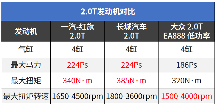 大众EA888的330系列发动机,最大的马力值为186Ps,最大的扭矩为320N·m。经过对比我们可以发现,在最大马力和功率上,红旗和长城的2.0T明显强于低功版的EA888,至于高功版的EA888,最大马力也不过是220Ps,基本上没有差距。
