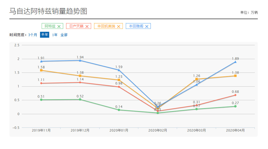 阿特兹在中型车市场虽然有着非常高的人气,但市场销量却十分平平无奇。对比雅阁、凯美瑞、天籁这些同级别竞争对手从销量对比图中就能非常直观的看出差距。最主要的原因还是在于产品主打运动和操控定位,而非家用属性,加上车内空间设计又是马自达车型一贯的弱项,才导致了阿特兹的小众化。