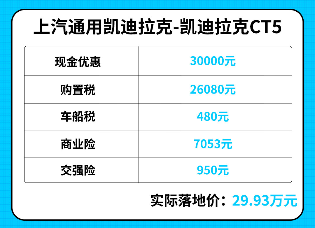 在售价方面凯迪拉克品牌向来十分有诚意,经过到店调查,CT5目前已经全系提供了3万的现金优惠,并且有意向的还可以与销售洽谈争取更大幅度的优惠。28T 时尚运动型指导价29.47万,优惠后裸车价达到26.47万。实车落地价仅比标定的指导价高不足5000元。