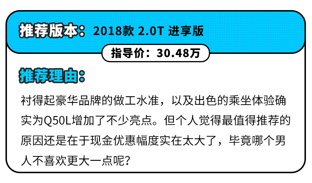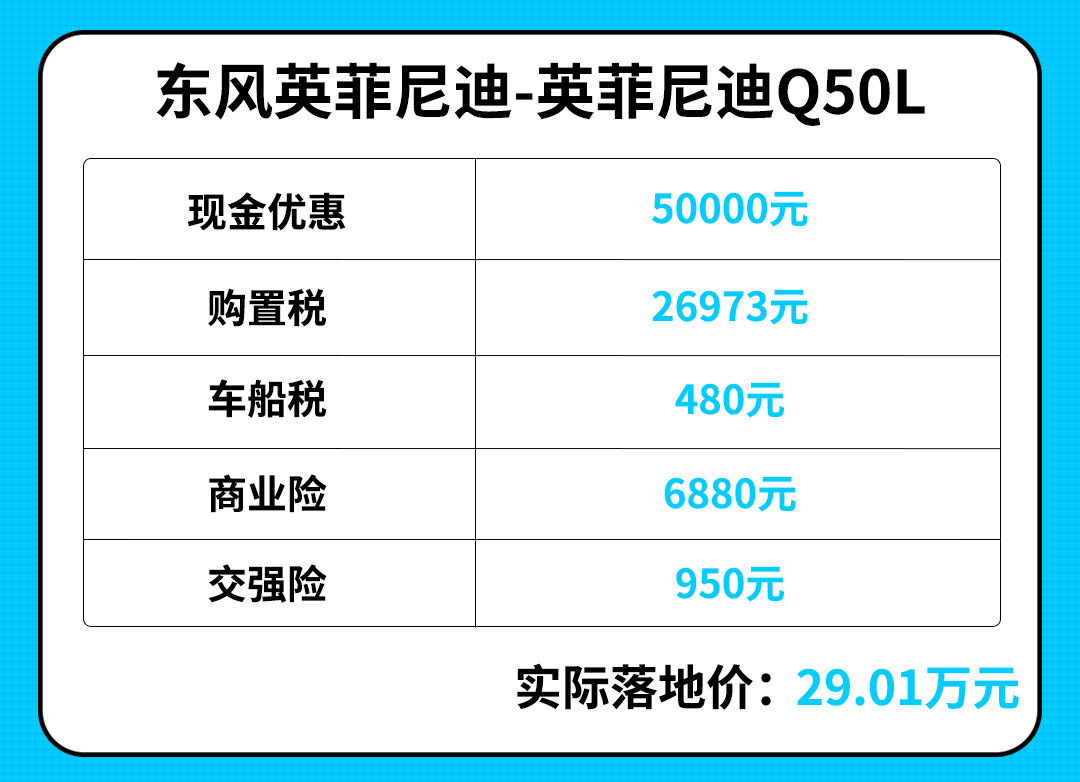 由于Q50L已经上市多年,因此车型优惠非常可观,普遍达到5~6万的现金优惠幅度。2.0T进享版优惠完裸车价为25.48万,对比同价位的帕萨特和亚洲龙,英菲尼迪Q50L难道不香吗?而车辆的实际落地价为29.01万,落地价真就比指导价更低,四舍五入等于白给。
