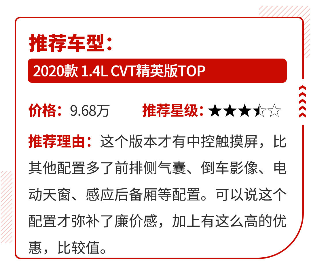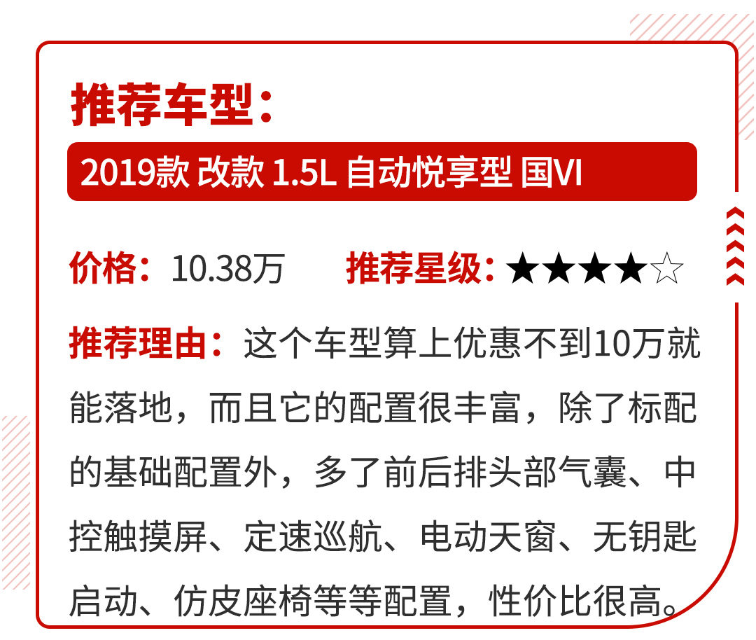 这款车的优势同样在于价格,7.28万起步,目前还有1.5万以上优惠,其实价格算下来跟威驰差不多。而且悦纳刚刚换代,颜值上算是贴合潮流,比久未换代的威驰好看太多。外观上采用了较为激进的格栅设计,看上去并不显廉价,内饰上还有悬浮中控屏修饰,也并不落后。所以说这款车虽然价格低,但充分考虑了消费者的需求,开出去不会没面子。