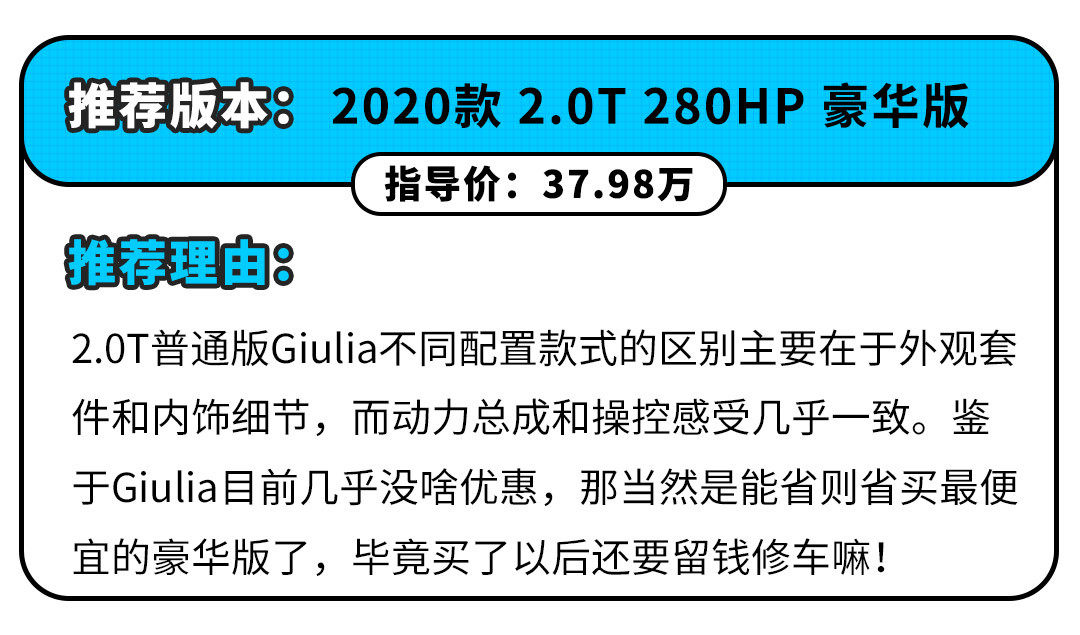 所以说,你要是因为欣赏2.0T普通版Giulia的操控性和驾驶乐趣而购买它,那完全没问题,但如果你仅是因为阿尔法·罗密欧这个品牌的逼格而去购买,那就大可不必选这款车,BBA同级车哪一个空间、舒适性和可靠性不比Giulia强呢?