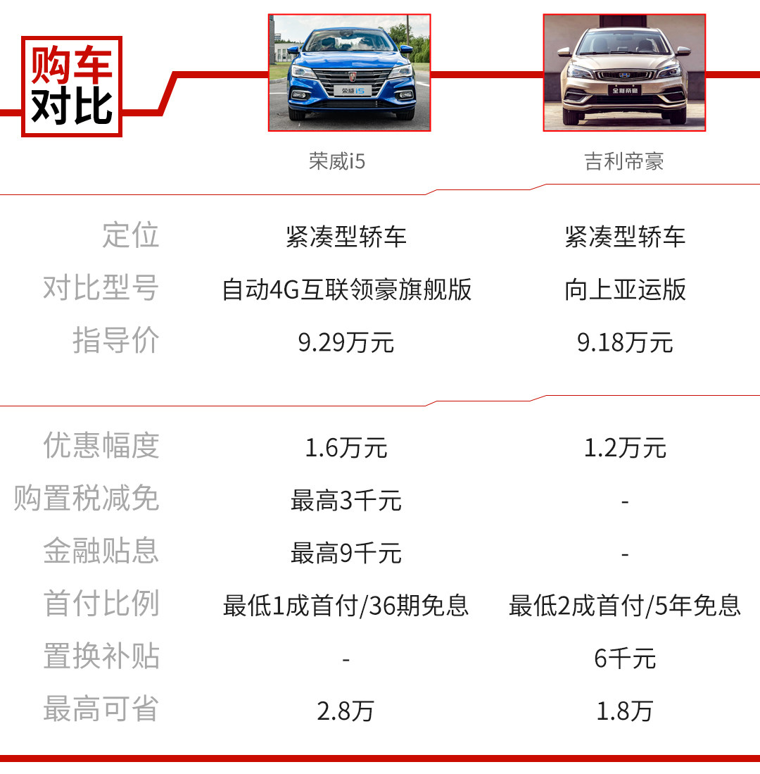 同时还推出金融优惠降低购车压力,荣威i5金融贴息至高9千元,最低1成首付、36期免息;而吉利帝豪则没有金融贴息优惠,只有置换补贴最高6千元,全系2成首付、5年0息。综合对比下来,毋庸置疑荣威i5更具诱惑力。