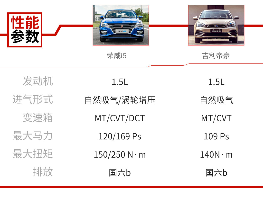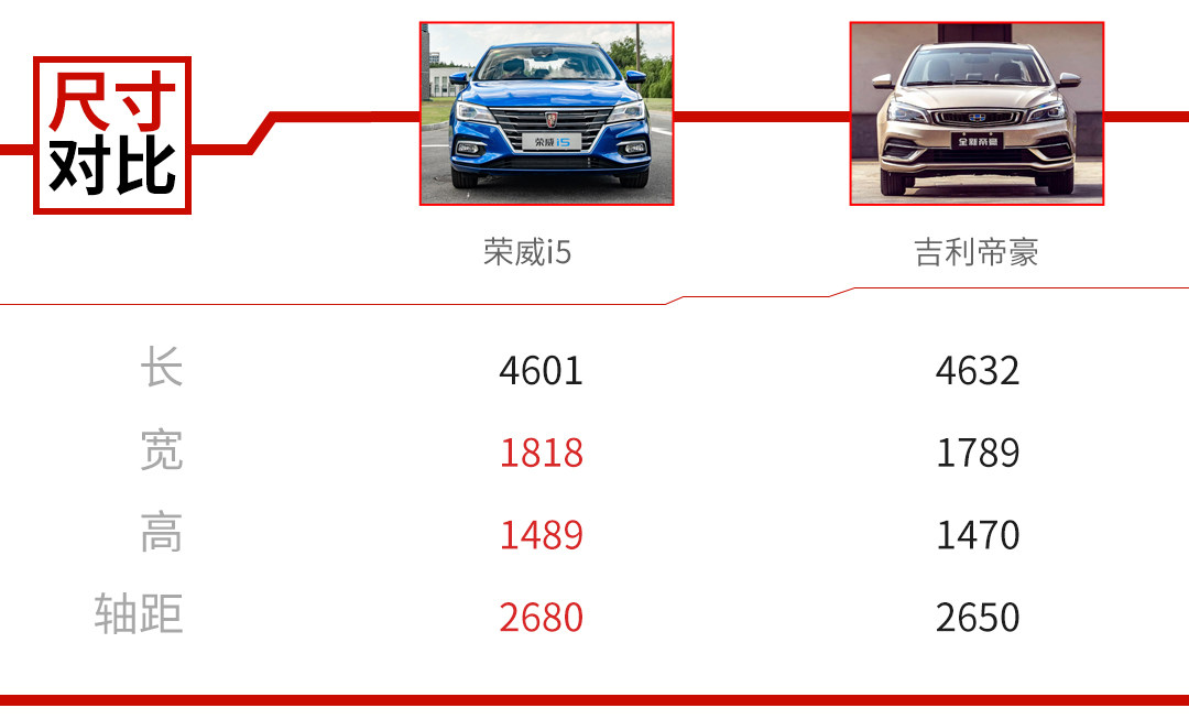 车身尺寸上,两者都能属于主流紧凑型轿车的表现,帝豪车身长度稍长一点,而荣威i5在宽度、高度、轴距都全面优于帝豪,这是车内良好空间表现的大前提。