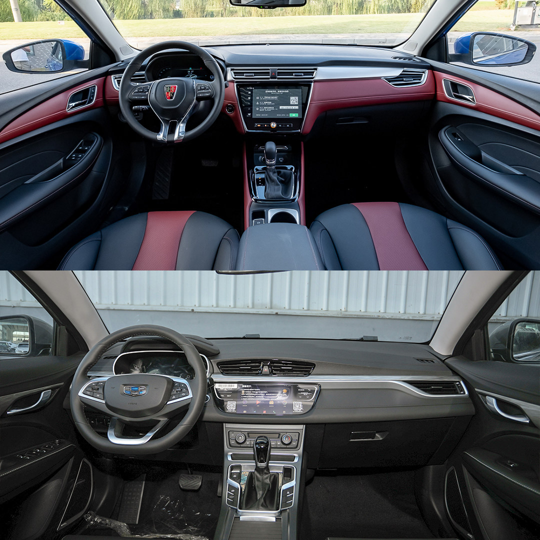 在内饰氛围和触觉体验上,更体现出两者的差距。荣威i5的内饰采用更大面积的软皮质包裹,并且红黑拼接,营造出的氛围更有活力,更有品质感;而吉利帝豪的内饰以黑色为主色调,软质包裹较少,质感稍逊一筹。