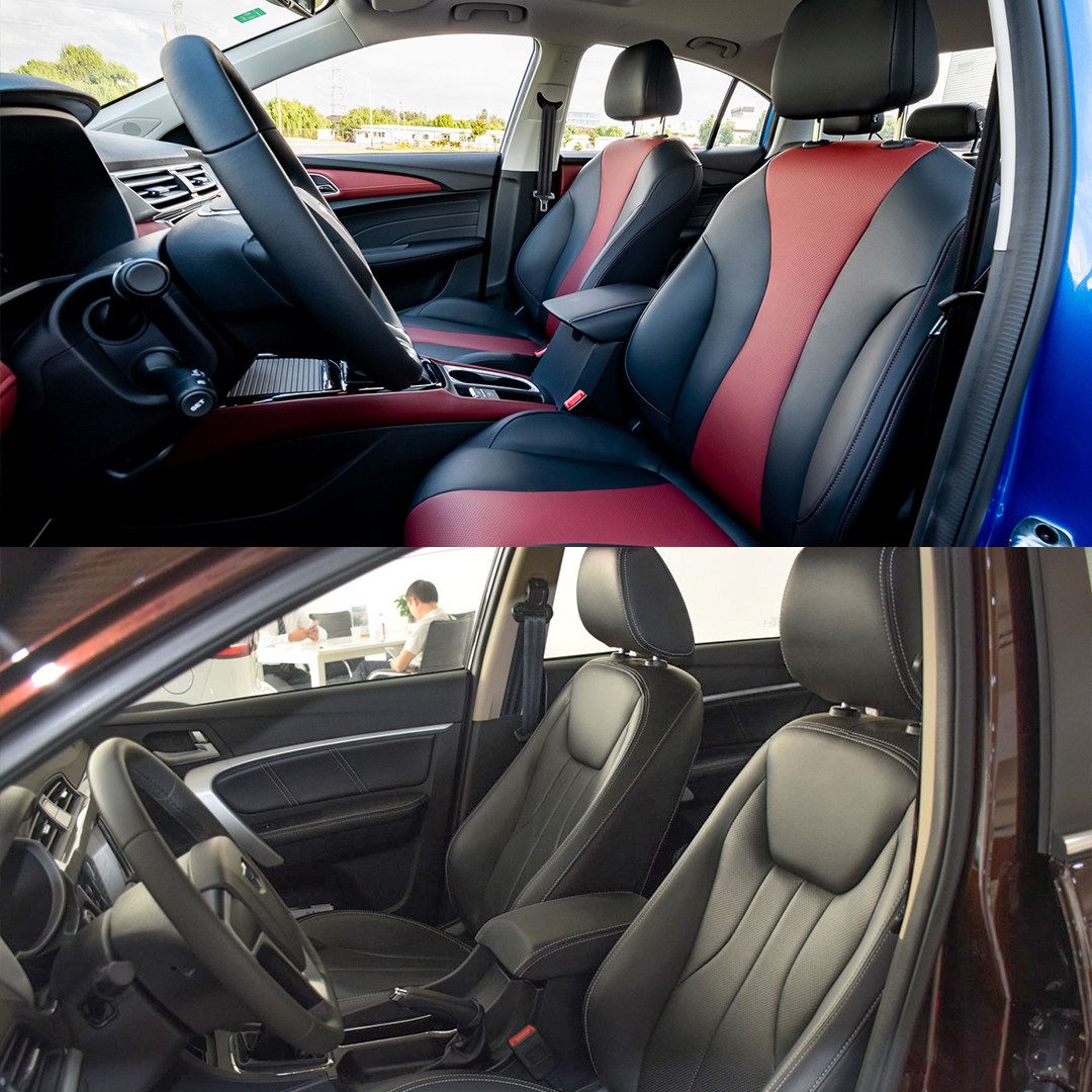 同样是仿皮材质的座椅,荣威i5的皮革触觉更细腻柔软,精致而且独到,采用饱满的填充物与更大的侧翼,包裹性和乘坐体验都较为出众;相比之下,吉利帝豪的皮质触感和填充物都中规中矩,没有过于突出的亮点。