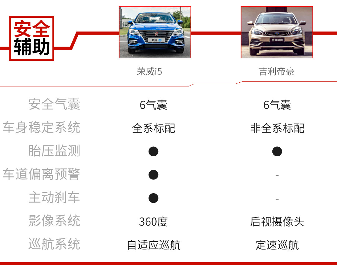 假如你对安全有更高的要求,在高配的车型上,荣威i5配备了越级的安全配置,全方位的前后一体式侧气帘,全车6安全气囊;并且配备车道偏离预警和主动刹车系统,巡航系统也升级为自适应巡航,领先于同级别和同价位;相比之下,吉利帝豪即便是去到顶配车型,也只配备有6气囊,其他的辅助驾驶配置并无升级,落后于当下的智能辅助驾驶趋势。