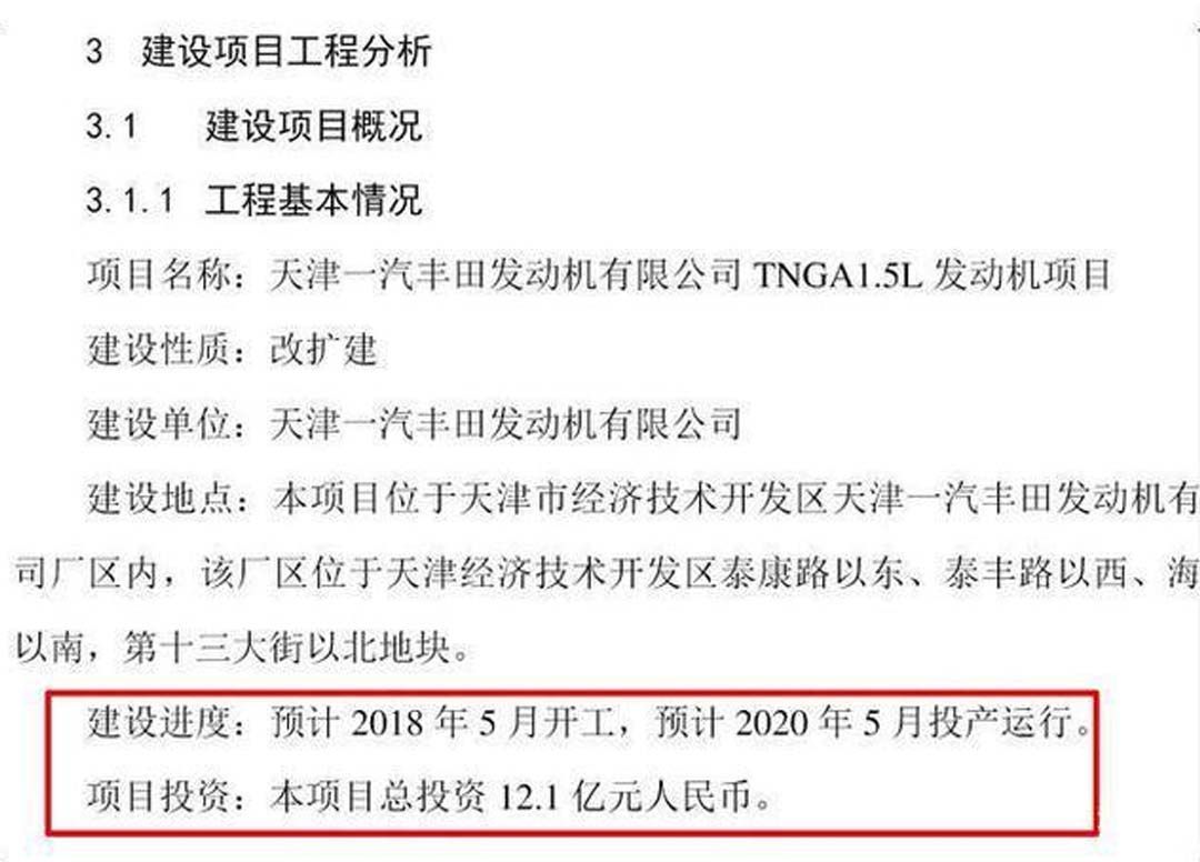 早在几年前,网上就有爆出天津一汽丰田发动机有限公司生产TNGA1.5L发动机的改扩建项目,根据资料来看,项目预计2018年5月开工,2020年5月投产,总投资12.1亿人民币。项目建成后,将年产10.8万台NGA1.5L发动机,同时调整1.2T发动机产能,使其每年减少10.8万台。如果消息属实,那么丰田将用TNGA1.5L发动机替换现款的1.2T发动机。