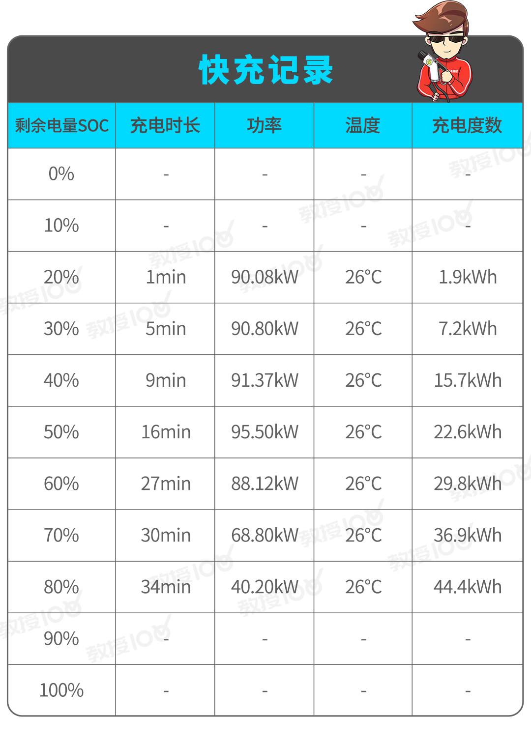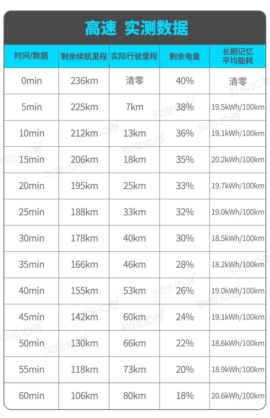 在高速路段压着限速(80-100km/h)跑了将近80km后,车辆的最终能耗定格在19.2kWh/100km,在每隔五分钟记录的数据当中,只有两次突破了20kWh/100km,这在教授测试的众多电动车里头,没几款能做到这一成绩。