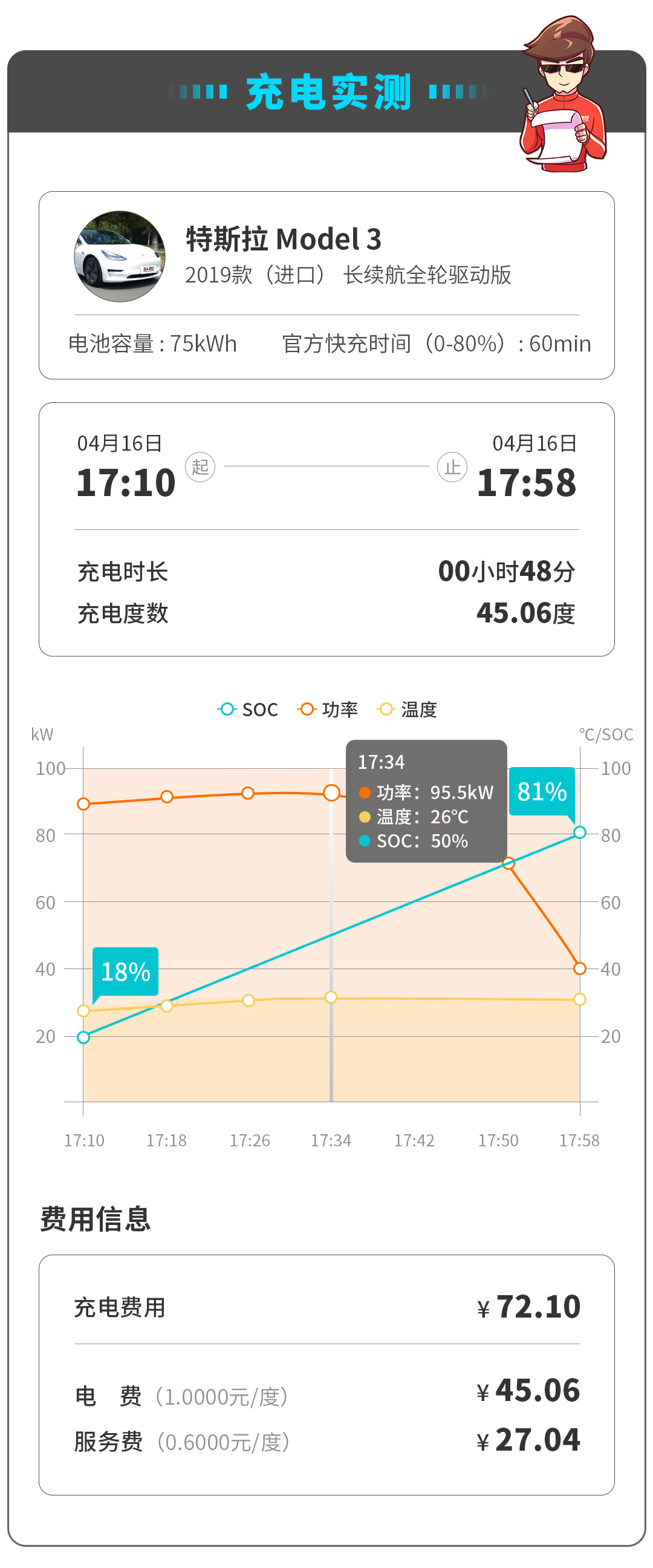 整个快充过程(20-80%)合计用时46min,充电效率远不如在特斯拉超级快充站的自家充电桩,可以看出Model 3还是比较“挑食”的。快充用时46min,比起其他竞品确实没有过多优势可言。