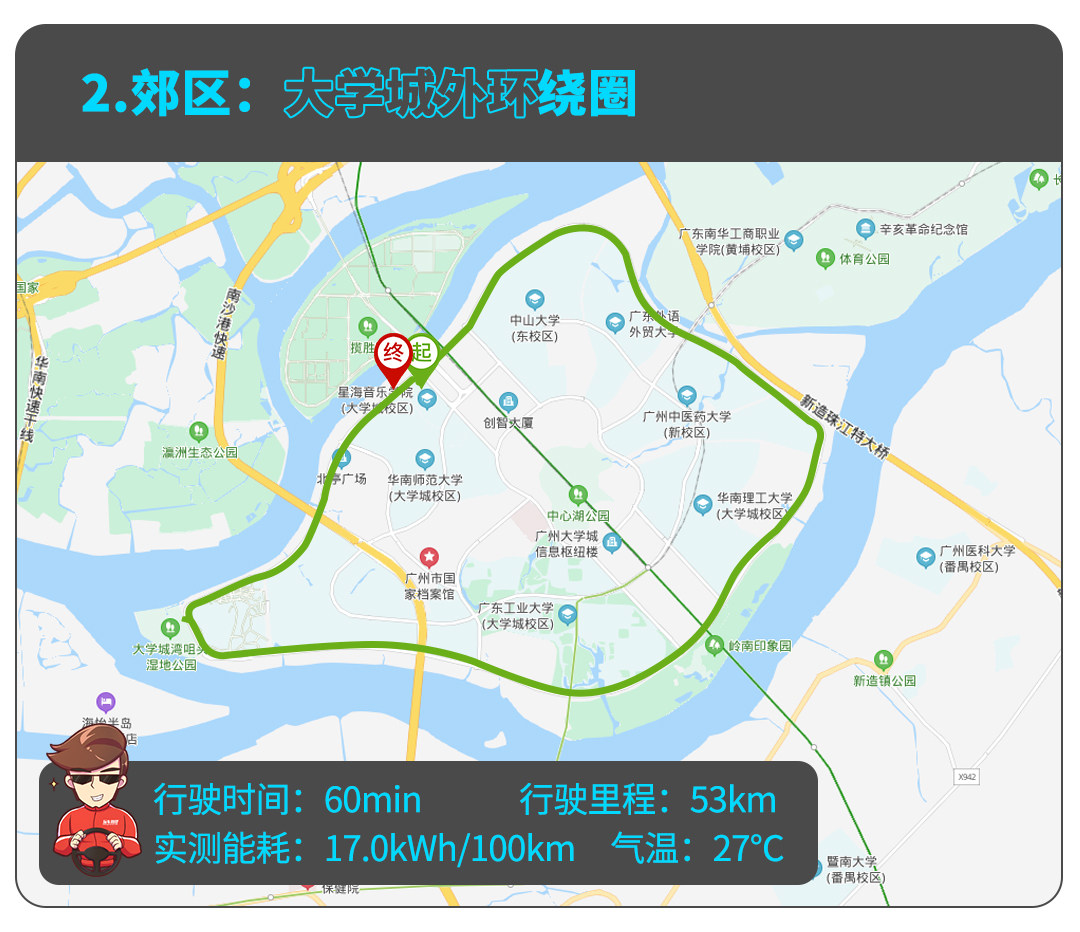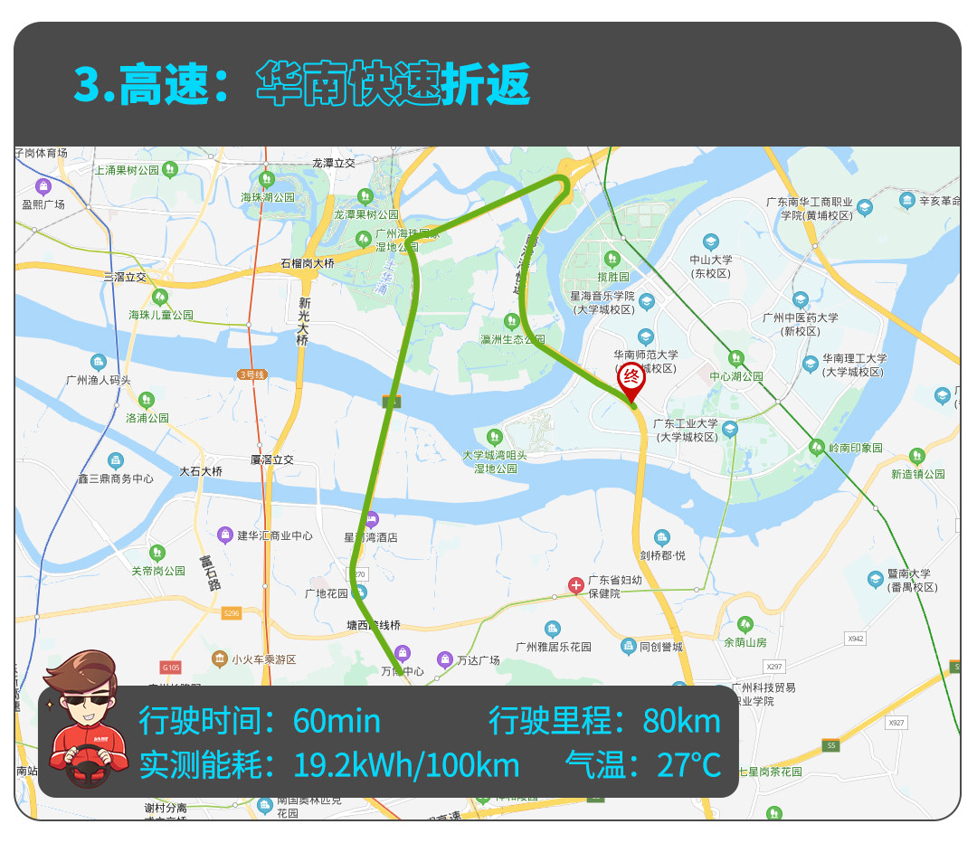 工信部测得Mode 3的百公里能耗相当出色——12.7kWh,实际体验下来,车辆行走在广州市区的早高峰路段,教授测得平均能耗为15.1kWh,与工信部数据出入不大,车辆市区能耗表现出挑。