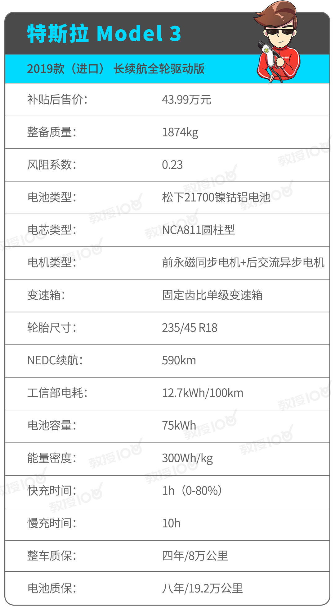 全轮驱动长续航版进口Model 3选用由松下提供的21700镍钴铝动力电池组,NCA811圆柱形电芯造就电池组300Wh/kg的高能量密度,75kWh的电池容量足以支持车辆在NEDC工况下续航590km。