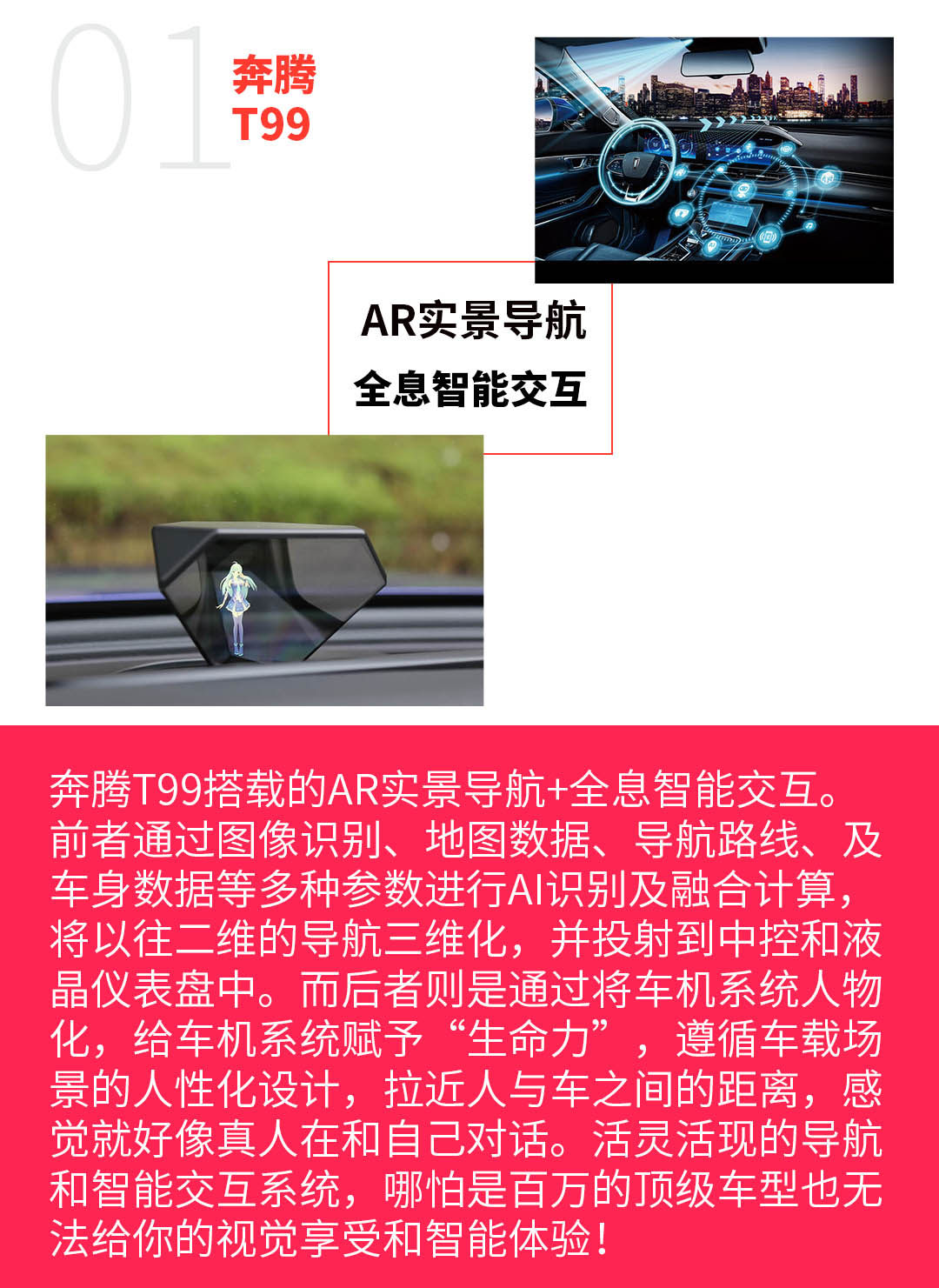 全息智能交互+AR实景导航,如此高大上,即便是某些百万顶级豪车也不能及的黑科技同时出现在同一辆车上,那么这款车的价格岂不是要“逆天”?但真相是奔腾T99的售价仅为14.99-18.99万元,并且除了上述两项为人津津乐道的配置,奔腾对于T99其他方面的产品力打造同样也是不遗余力。