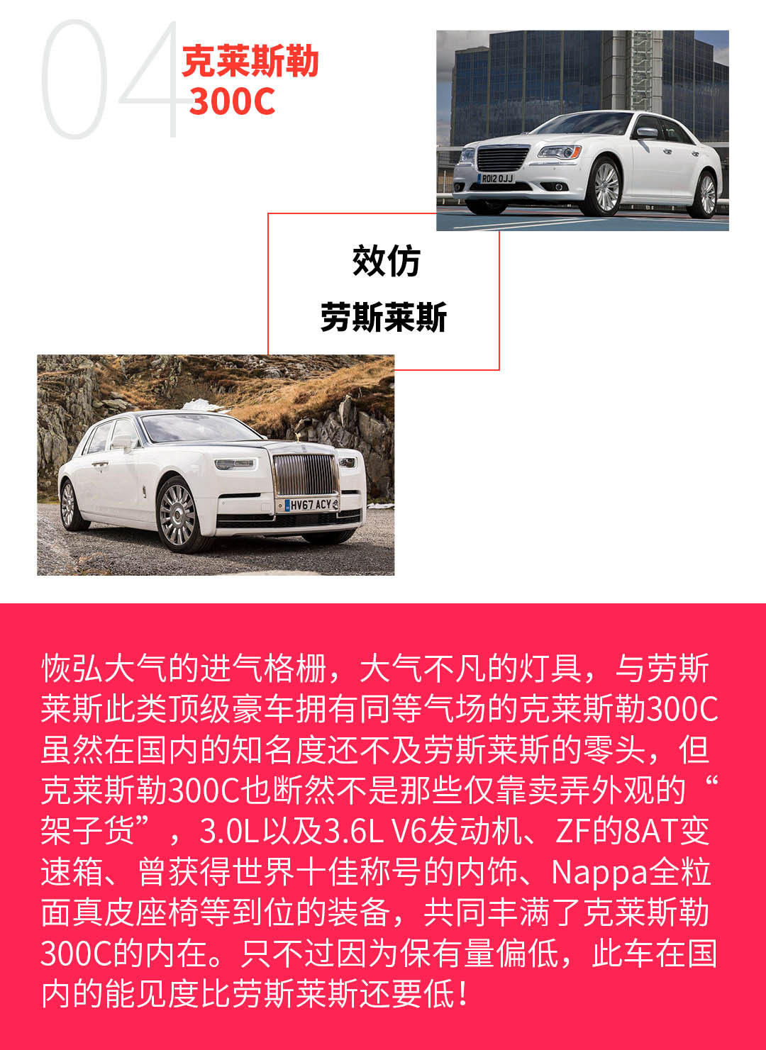 虽然相比动辄数百万的劳斯莱斯,克莱斯勒300C 39.99-49.19万元的一手新车指导价已经足够亲民,但如果想要达至花最小的钱装最大的bi的效果。可以选择购置二手车,十来万的车价也能带来百万的气场。